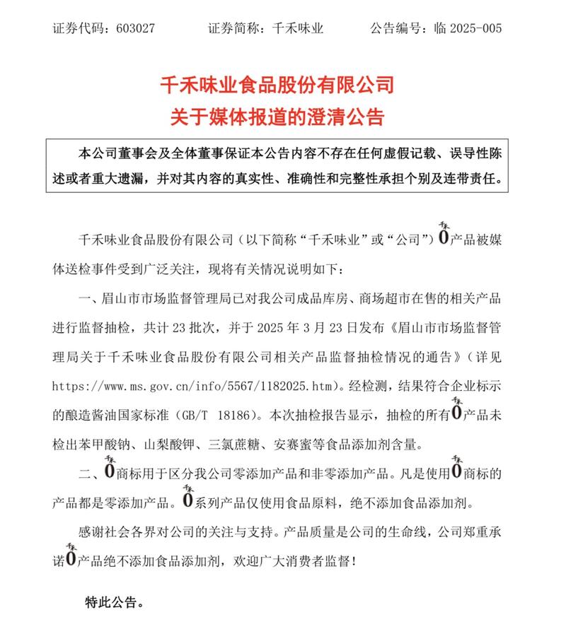 新京报讯(记者刘欢)针对此前媒体报道千禾味业“零添加”酱油检出“镉”及“千禾0”酱油不是“零添加”争议事件,3月24日,千禾味业食品股份有限公司(以下简称“千禾味业”)再次发声,发布公告称四川眉山市市场监督管理局已对公司成品库房、商场超市在售的相关产品进行监督抽检,共计23批次,经检测,结果符合企业标示的酿造酱油国家标准(GB/T18186)。